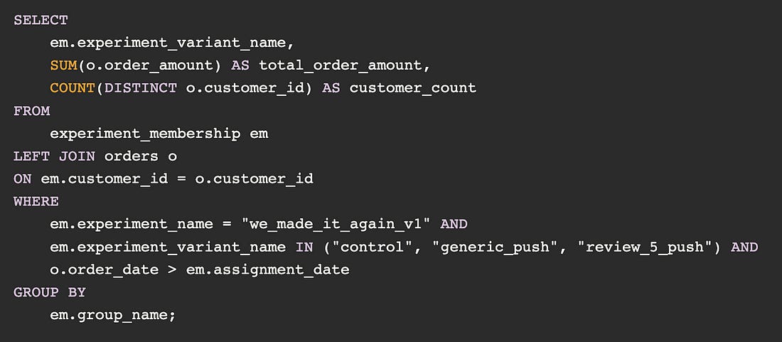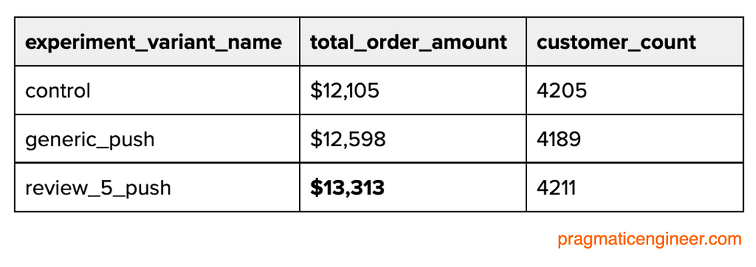 The bottom of this article could be cut off in some email clients. Read the full article uninterrupted, online. With that, it’s over to Alexey: I’ll never forget the first time I made my employer a million dollars. I was running a push notification A/B test for meal delivery startup Sprig, trying to boost repeat orders. Initial results were unpromising; the push notification was not receiving many opens. Still, I wanted to be thorough: before concluding the idea was a failure, I wrote a SQL query to compare order volume for subsequent weeks between customers in test vs control. As it turned out, our test group “beat” the control group by around 10%: I plugged the numbers into a significance calculator, which showed it was statistically significant – or “stat-sig” – and therefore highly unlikely to be a coincidence. This meant we had a winner on our hands! But how meaningful was it, really, and what would adding the push notification mean for revenue, if rolled out to 100% of users? It turned out this experiment created an additional $1.5 million dollars, annually, with just one push notification. Wow! I was hooked. Since that day, I've shipped hundreds of experimental “winners” which generated hundreds of millions of incremental revenue for my employers. But you never forget the first one. Moments like this is what growth engineering is all about. 1. What is Growth Engineering?Essentially, growth engineering is the writing of code to make a company money. Of course, all code produced by a business on some level serves this purpose, but while Product Engineers focus on creating a Product worth paying for, Growth Engineers instead focus on making that good product have a good business. To this end, they focus on optimizing and refining key parts of the customer journey, such as: