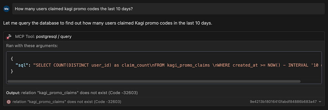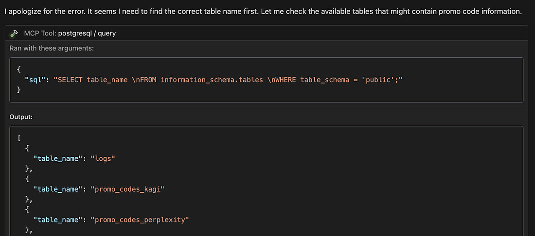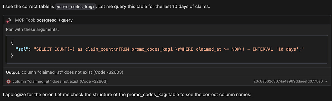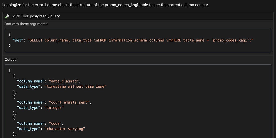 The LLM tries to generate an SQL server to get the answer, but hallucinates the table name (which is typical-enough for LLMs): However, this is where the “magic” begins, thanks to the LLM iterating more — using this new database tool it can utilize. The LLM turns to my PostgreSQL instance to find the correct table name: It then makes another query: D’oh! – the column names are wrong, again! But it queries the table definition and corrects it rapidly: Finally, it gets it right: What’s so impressive is that the process took a few seconds, and I never had to add any input. The LLM “figured out” the correct table and column names by having access to the database. LLM layer above PostgreSQLNow I’ve added my database as an MCP server, I can “talk” to my data using natural language, and the LLM does the conversion to SQL, and then re-converts to my question. This is not limited to simple questions with a simple SQL query, but also to more ambiguous ones. Other questions I’ve asked: