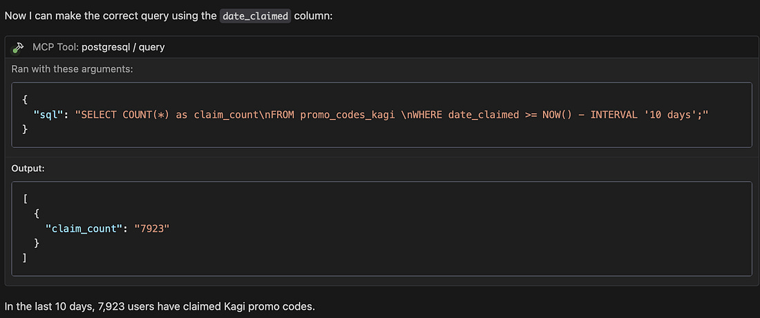 For this piece, I talked with MCP co-creator, David Soria Parra, software engineer at Anthropic. Thank you for the input! The bottom of this article could be cut off in some email clients. Read the full article uninterrupted, online. 1. What is MCP? A practical exampleI have an API that powers this microsite where annual paid members can request a promo code for 12 months of complimentary access to Perplexity and 3 months of Kagi. The site runs on Node.js, using TypeScript, and uses PostgreSQL as its database. Whenever I tweak the back or frontends and modify data, I have two things open: