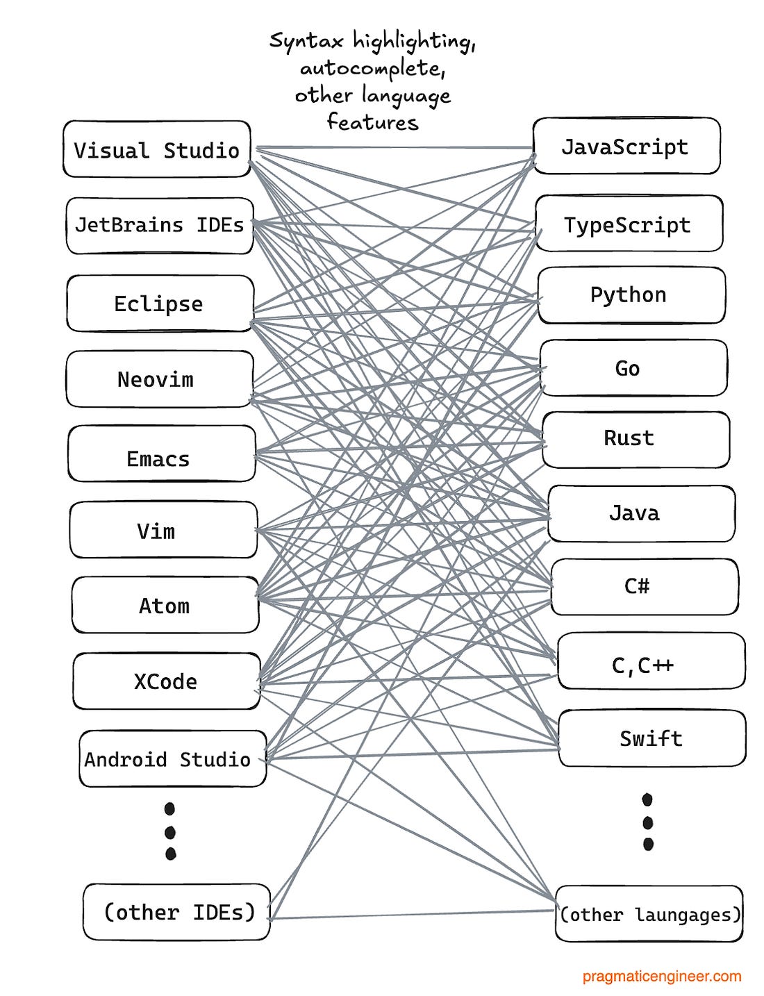 The only notable IDE currently absent is JetBrains IDEs, which is set to introduce MCP support in the next IDE release, expected soon. It’s rare to see such fast adoption across all major IDEs. Clearly, MCP is providing a big benefit for developers using AI tools, so IDEs want to add it. Coincidentally, the top IDEs that engineers most frequently mentioned as IDEs with AI functionality they love – Cursor, VS Code, Windsurf, Zed, Neovim and Cline – have all been amongst the first to ship MCP support! But how do they work? 3. Understand LSP to understand MCPLet’s take a diversion into the world of Language Server Protocols because this is the solution that inspired MCP. A common problem that IDEs had for decades was that they wanted to add support for as many programming languages as possible, which also meant adding support for things like: