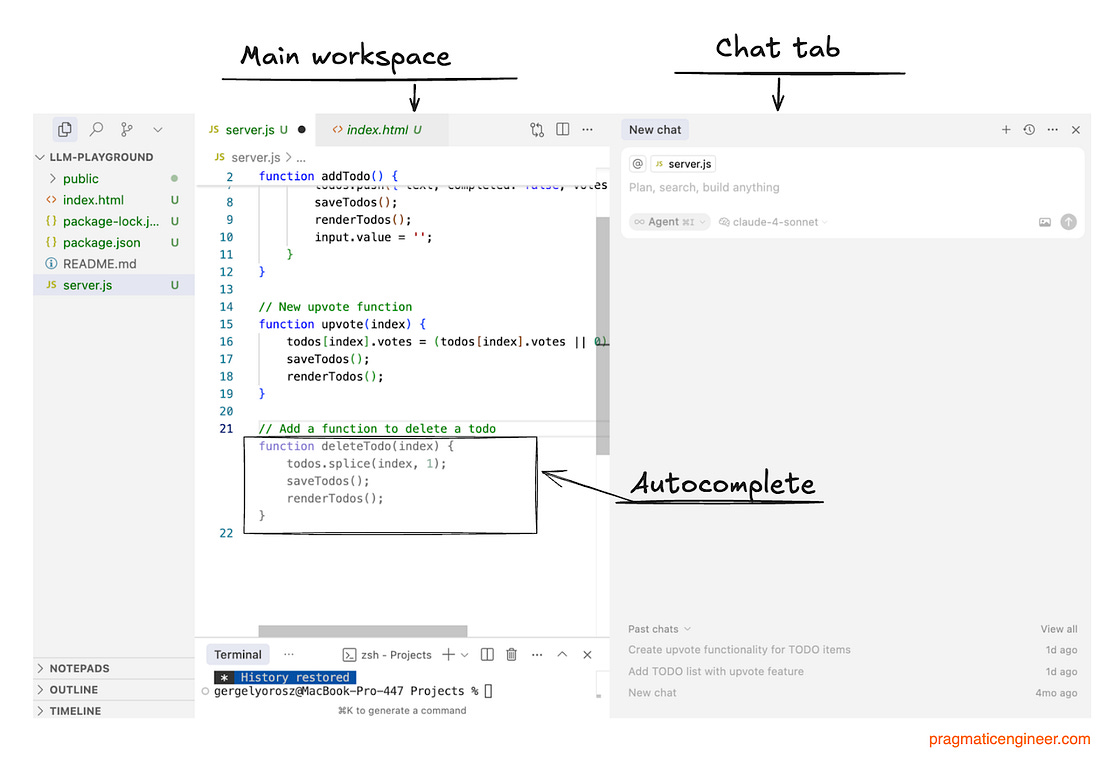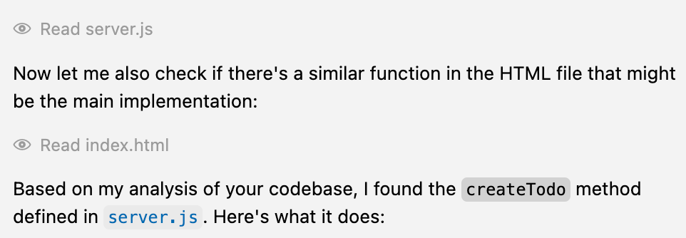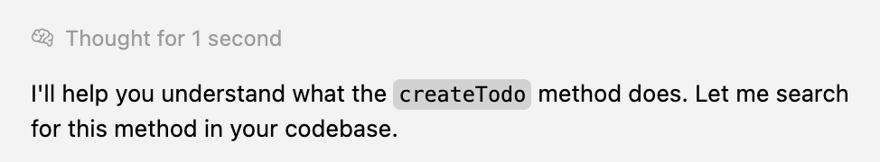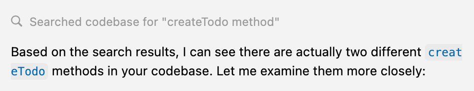 This “tab model” must be as fast as possible, and data transfer as low as possible. There’s always a tradeoff between how much context to send, and the quality of the suggestions: the more relevant context Cursor can send, the better the suggestions. However, sending lots of context can slow down the display of suggestions, so getting this right is one challenge for Cursor’s engineers. 3. How Cursor’s Chat works without storing code on the serverCursor supports a chat mode for asking about the codebase, “chatting” with the codebase, or asking Cursor to do things that will kick off an agent to refactor, add some functionality, modify a method, etc. No source code is stored on the backend, but all LLM operations are done there. The way it manages this is through indexes of the codebase. Here’s how it works: Asking a question in Chat mode: let’s take the example of asking about the createTodo() method, which is part of the codebase, defined in server.js. To complicate things, I defined a similar method called addTodo() in index.html, inline. Let’s see how Cursor gets on with this one! The prompt is sent to the Cursor server, where it interprets it, and decides it needs to execute a codebase search: The search starts: Search is done using codebase indexes. Codebase indexes are previously-created embeddings. It tries to locate the embeddings that are best matches for the context using vector search. In this case, the vector search returned two very close results: in server.js, and index.html. Requesting the code from the client: the server does not store any source code, but now requests the source code both from server.js and index.html, so it can analyze both and decide which is relevant: Finally, after the vector search and requesting relevant source code from the client, the server has the context it needs to answer the question: There’s a few things Cursor does behind the scenes to make these kinds of searches work. Semantic indexing code with code chunksTo allow vector search using embeddings like in the above case, Cursor first needs to break up the code into smaller chunks, create embeddings, and store these embeddings on the server. Here’s how it does this: