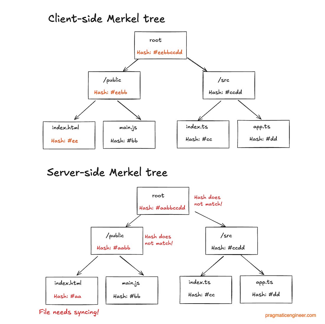 Cursor uses a very similar Merkle tree to this, except it uses obfuscated file names. The Cursor client creates a Merkle tree based on local files, and the server also creates one based on the files it has finished indexing. This means both the client and server store their respective Merkle trees. Every 3 minutes, Cursor does an index sync. To determine which files need re-indexing, it compares the two Merkle trees; the one on the client which is the source of truth, and the one on the server which is the state of the index. Let’s take the example of “index.ts” changing on the client-side: Tree traversal is used to locate where re-indexing is needed. Tree traversal is not something us developers implement much, but for this use case, Cursor engineers had to. The Merkle Tree makes tree traversal efficient because starting from the root node, it’s easy enough to tell if the hashes match. Where there are differences in the hashes, it’s also easy enough to find files that need to be synced. Just as importantly, the Merkle tree minimizes sync operations to only files that have changed. This Merkle tree structure fits nicely into Cursor’s real-world usage. For example, it’s common enough to shut down your computer at the end of the day, and then start the next day by fetching updates from the git repo. In a team, it’s common enough for a bunch of files to change by the next morning. With this Merkle tree, Cursor does as little re-indexing as possible, saving time on the client side and using compute as efficiently as possible on its server side. Secure indexingEven though Cursor doesn’t store code on the server-side, there are sensitive parts of a codebase that are a bad idea to send over, even when encrypted. Sensitive data includes secrets, API keys, and passwords. Using .gitignore and .cursorignore is the best way to keep indexing secure. Secrets, API keys, passwords, and other sensitive information, should not be uploaded to source control, and are usually stored as local variables, or in local environment files (.env files) that are added to the .gitgnore. Cursor respects .gitignore and will not index files listed there, nor will it send contents of those files to the server. Additionally, it offers a .cursorignore file where files to be ignored by Cursor should be added. Before uploading chunks for indexing, Cursor also scans code chunks for possible secrets or sensitive data, and does not send them. Indexing very large codebasesFor massive codebases – often monorepos with tens of millions of lines of code – indexing the whole codebase is extremely time consuming, uses a lot of Cursor’s compute resources, and is generally unnecessary. Using the .cursorignore file is the sensible approach at this point. The documentation offers more guidance. 4. Anyrun: Cursor’s orchestrator serviceAnyrun is the name of Cursor’s orchestrator component, and is written fully in Rust. Fun fact: “Anyrun” is a nod to Cursor’s company name, Anysphere... Subscribe to The Pragmatic Engineer to unlock the rest.Become a paying subscriber of The Pragmatic Engineer to get access to this post and other subscriber-only content. A subscription gets you:
