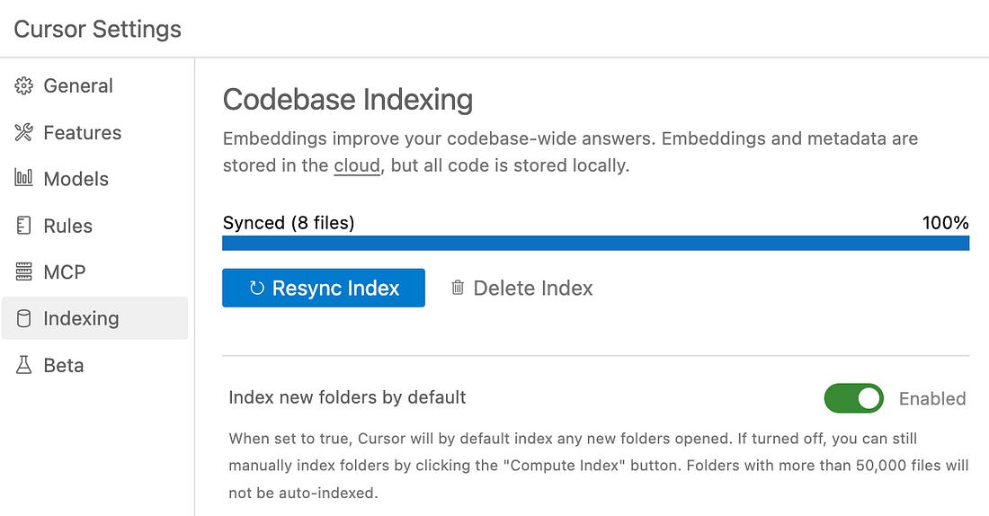 Creating embeddings is computationally expensive and is one reason it’s done on Cursor’s backend, using GPUs in the cloud. Indexing usually takes less than a minute for mid-sized codebases, and can take minutes or longer for large codebases. You can view the status of indexing inside Cursor, at Cursor Settings → Indexing: Keeping the index up-to-date using Merkle treesAs you edit the codebase with Cursor or another IDE, Cursor’s on-server index becomes out of date. A naive solution would be to run the reindexing operation every few minutes. However, because indexing is expensive in compute – and uses bandwidth by transmitting encrypted code chunks – this is not ideal. Instead, Cursor makes clever use of Merkle trees and a high-latency sync engine to keep on-server indexes up to date. A Merkle tree is a tree whose every leaf is the cryptographic hash of the underlying file (e.g. the hash for the file main.js). And every node is a combination of the hashes of its children. A Merkle tree of a simple project with four files looks like this: How this Merkle Tree works:
