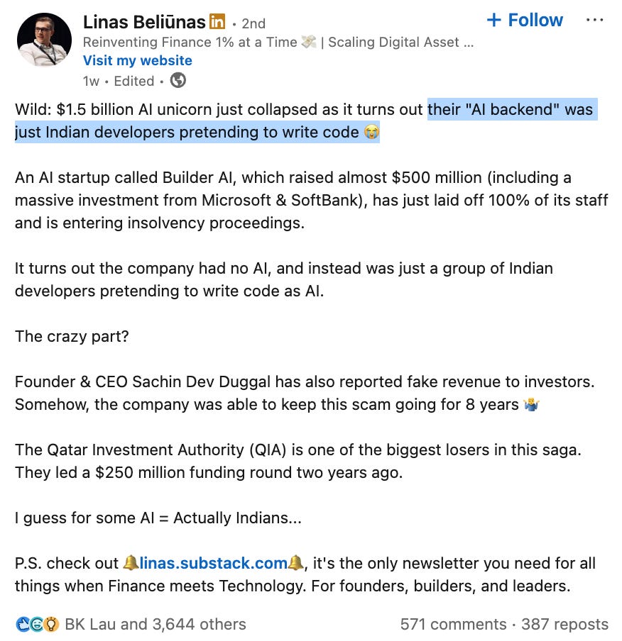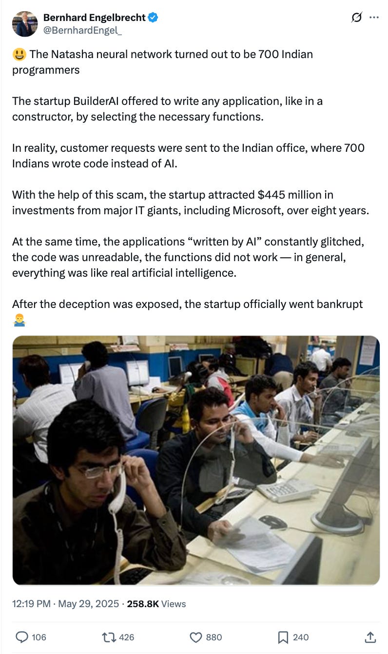 1. No, Builder.ai didn’t fake AI with 700 engineersAn eye-catching detail widely reported by media and on social media about the bankrupt business Builder.ai last week, was that the company faked AI with 700 engineers in India:
