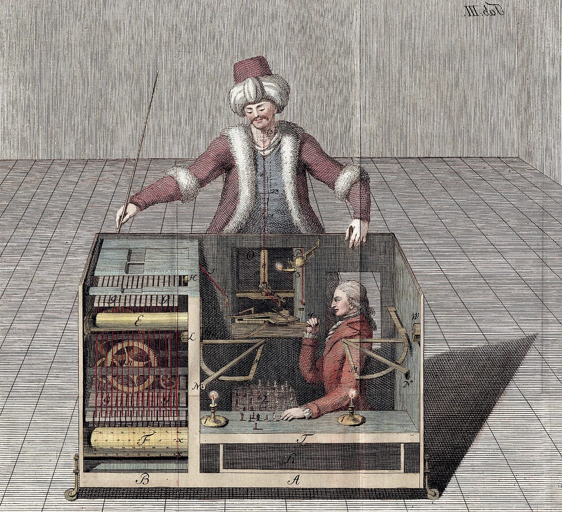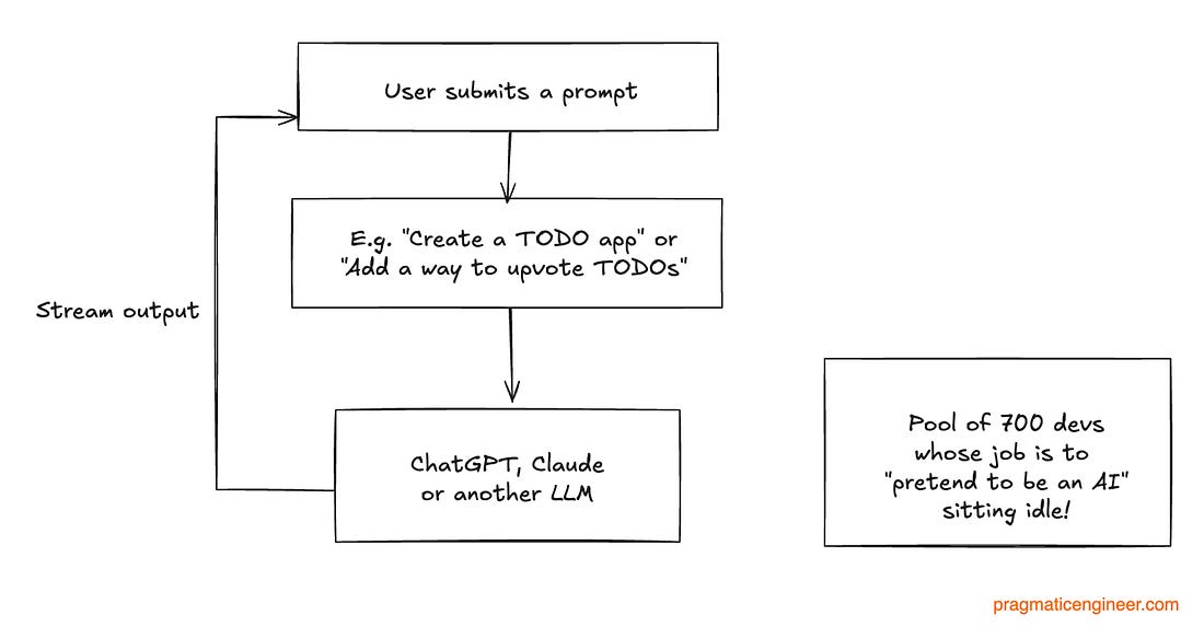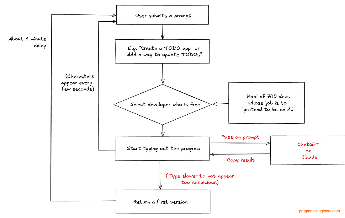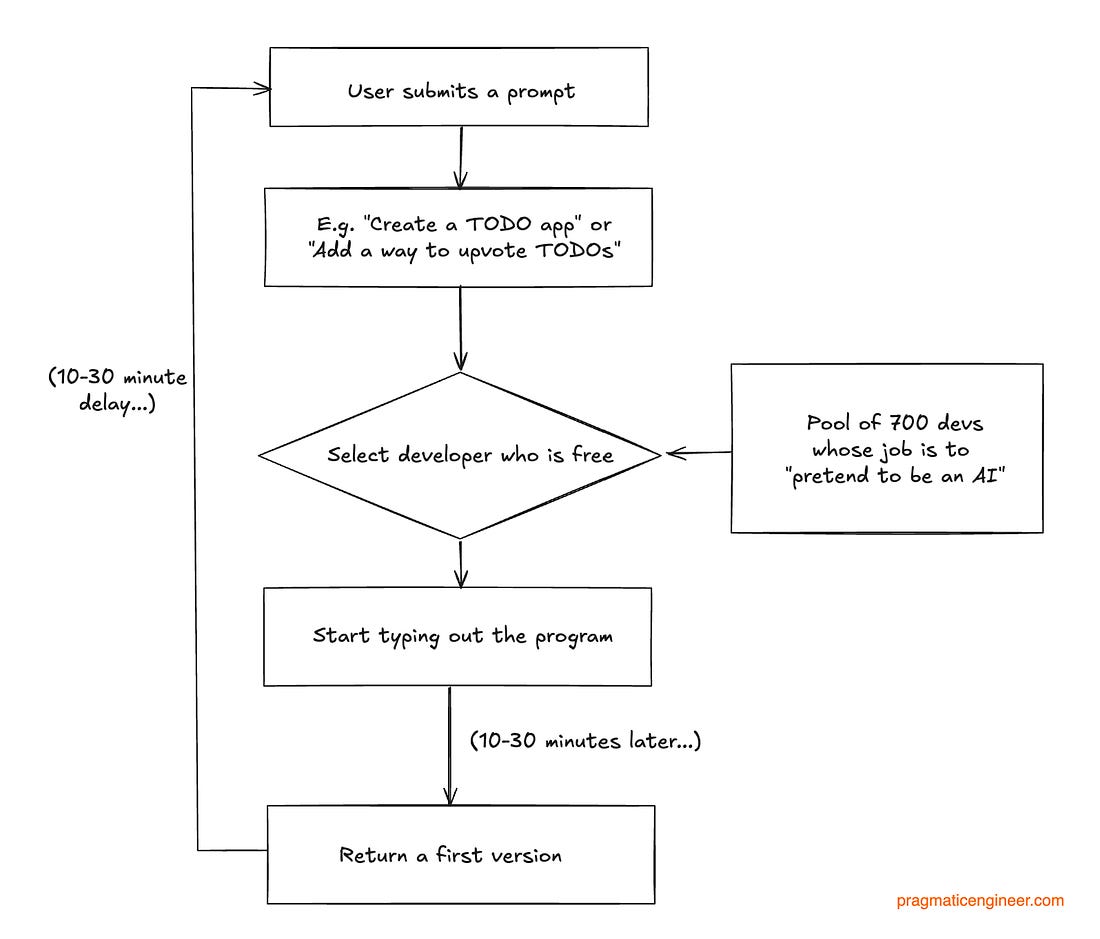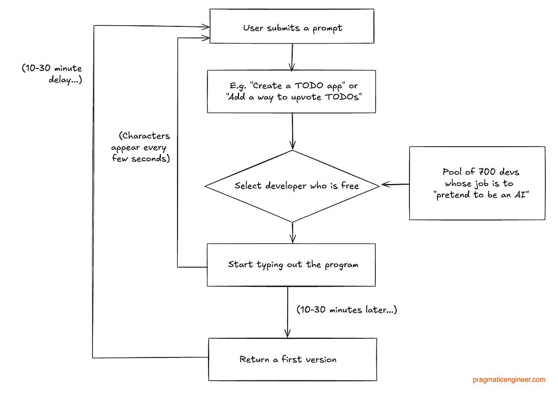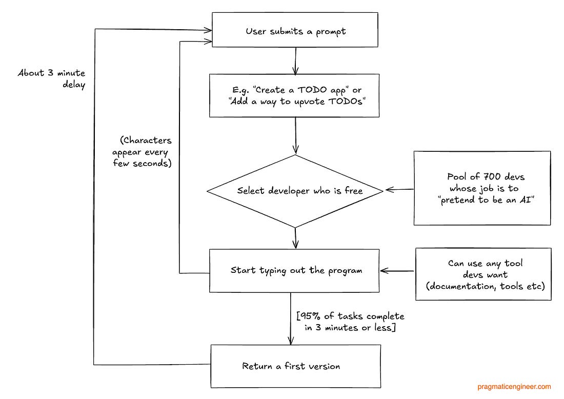 The Automaton Chess Player concealed a person inside the machine, which went unnoticed for more than 80 years: Back to the current problem, and applying the inspiration of the 18th century chess machine containing a concealed human. To improve latency – and decrease users’ suspicion – we could perhaps stream what the “assigned developer” typed: This is better, but it remains a giveaway that the system is slow to complete basic tasks. So what about incentivizing our developers with a bonus for completing tasks under 3 minutes, and allowing them to use any tool they want? Incentives are powerful, so it’s likely the following would be observed: We did it! We managed to fake a good enough AI. But wait… how exactly did the devs complete their tasks within the arbitrary time frame of 3 minutes? To find out, questions are asked, and this what we see (remember, it’s 2024): Wait… what?! “Devs pretending to be an AI would use an AI to deliver the outputs in time? This is a logical approach for 2024, when LLMs were already more than capable of generating high-quality code. And this is why it would be irrational to hire 700 developers to pretend to be AI last year, when there were already LLMs that did this much better. If you hired a competent engineer in 2024 to design a system that takes a prompt and pretends to be an AI, and they could use any tool they liked, and there were 700 devs for the project, what they built would look something like this: Spoiler: Builder.ai did exactly this as well! Natasha’s tech stackBuilder.ai first showcased the idea of Natasha in 2021, well before ChatGPT was announced. Back then, Natasha was positioned as a “personal app builder,” and it was clear that the solution worked with a “network of geeks” who built apps to spec:
