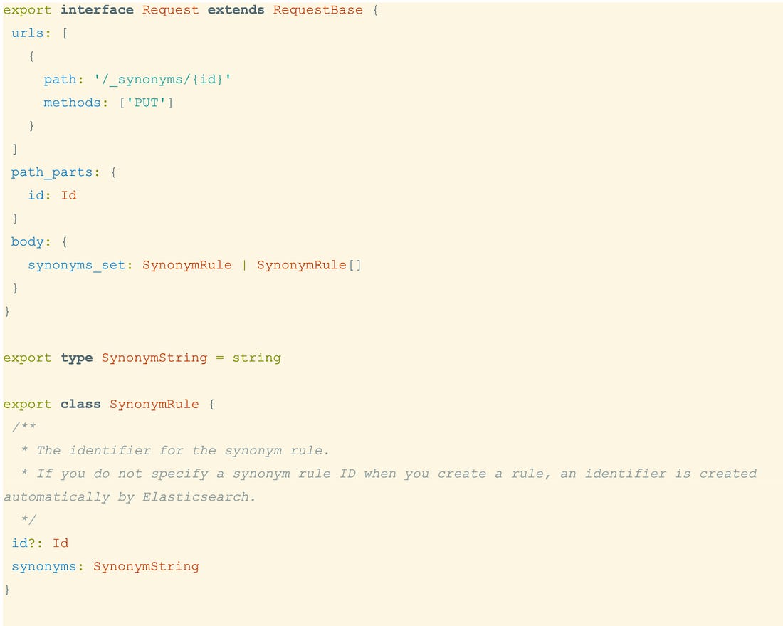 #2: Custom generatorsThe biggest problem with manually writing code is the lack of consistency, so how can you keep several SDK clients consistent with each other? The most straightforward way is to generate all SDKs from one specification. This is the approach Elastic took for Elasticsearch, whose SDKs are generated from the Elasticsearch specification. This specification defines more than 500 APIs, and each API specification is written declaratively in TypeScript. Here is an example: