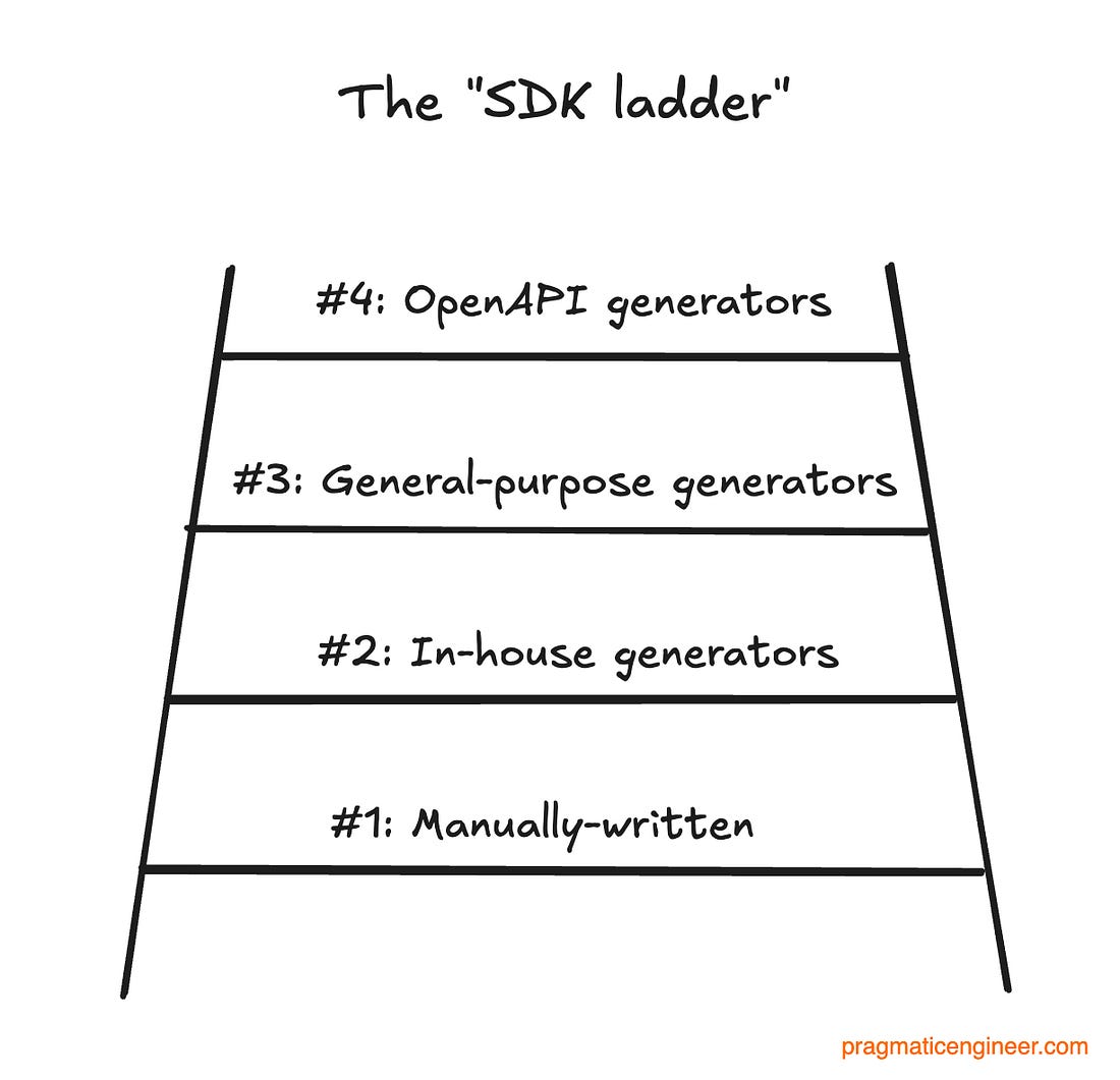 As mentioned in the Elasticsearch docs, many systems claim to offer an S3-compatible API, despite failing to emulate S3’s behavior in full, which has led to some interesting Elasticsearch support cases. Should SDKs be open source?Yes! Simply put, this offers the best developer experience. Using only open source dependencies is a given across many platforms and industries. Nothing would be more frustrating than trying to debug an API call, then realizing you can’t see exactly what the SDK is doing, or being unable to step into a debugger. Open-sourcing an SDK can also help LLMs use it, for example by looking at integration tests. Additionally, since SDKs are aimed at developers, they’re often technical enough to be improved when needed, and to submit a change as a pull request when relevant. This is a great way to grow a community while making users happy. What about competition, then? Even if AWS S3 and OpenAPI SDKs invite competition, making the SDKs private would hurt them more. However, anything that isn’t published to users can be kept private, as we did at Elastic with the client generators, which are not trivial to replicate. Finally, are closed source SDKs essential to fight ad fraud? No! It’s easy to observe requests made by the SDK itself, and the intelligence of an anti-fraud system should be in the API, not the SDK. In my opinion, SDKs should always be open source. 3. How to build an SDKWhen starting an SDK, you need to decide how to build it. I like to think of the options as an “SDK ladder.” Each step requires less work to scale, at the cost of giving up some of your control: