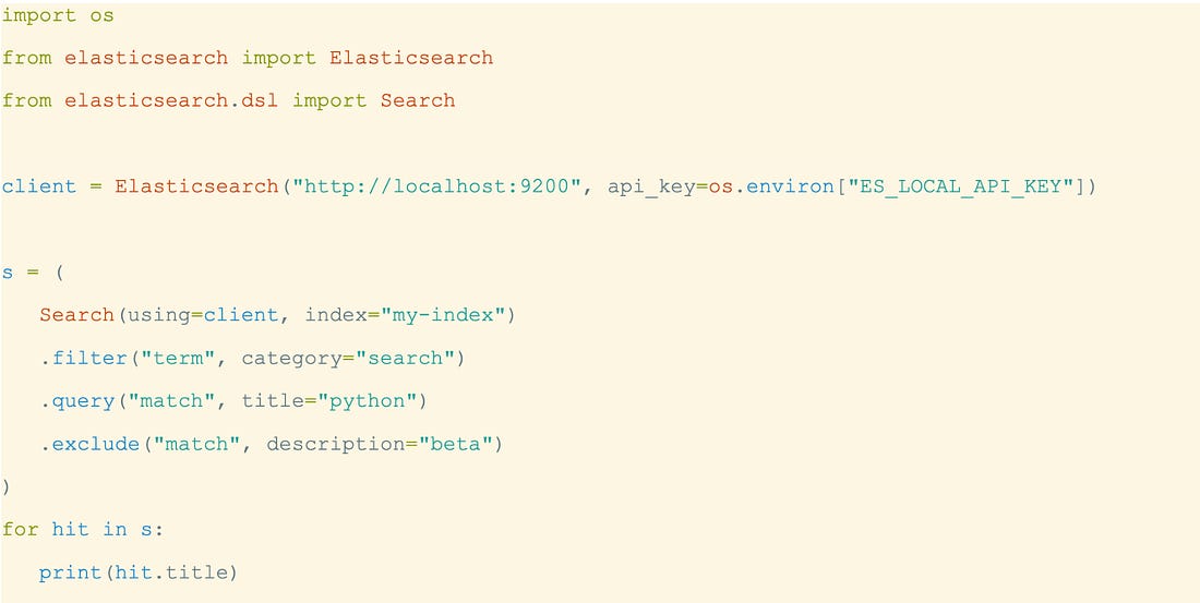 But today, these tools are obviously no longer bundled in physical form; the software is distributed from package registries, and users – and LLMs – read their docs online. The name SDK has stuck and today refers to libraries that enable third-party developers to use a specific technology, directly. This article focuses on a specific subset: SDKs for HTTP APIs. SDKs are different from frameworks. You can invoke them from the code you write, whereas frameworks invoke the code you write. Therefore, frameworks enforce a specific, opinionated code architecture which SDKs do not. Why build an SDK for an API when there’s already an API?The standard way to allow software engineers to integrate products is to offer an HTTP API. However, you’ll notice that some popular consumer companies provide an API without an SDK, such as the social media platform Bluesky, previously covered in the deep dive, Inside Bluesky’s engineering culture. Other companies consider an SDK so valuable that it’s built for internal-only APIs. So, what are its benefits? Let’s take an Elasticsearch query with a few filters as an example. Without an SDK: Below is the same query with the Elasticsearch Python client, which handles authentication, headers, and error handling. This allows you to think more about queries, and less about how to send them: While I like the above because it hits a sweet spot between conciseness and readability for larger codebases, many of our users love the domain-specific language (DSL) module, which is even more concise and Python-like: 2. Why build an SDK?Conciseness is one reason to build SDKs, as shown in the above example. But there are others: Simplify API usage. Developers can explore the complete API surface from the comfort of their IDE, using autocompletion to see the options. Also, precise types give instant feedback, eliminating an entire class of errors. For example, all Elasticsearch Inference APIs are available under client.inference, and each parameter has a description and type hint. Since SDKs abstract away many concerns in calling an API, this can be done with a few simple lines of code, which helps users and LLMs. Improve documentation. Good SDKs also include documentation tailored to the programming language, such as: