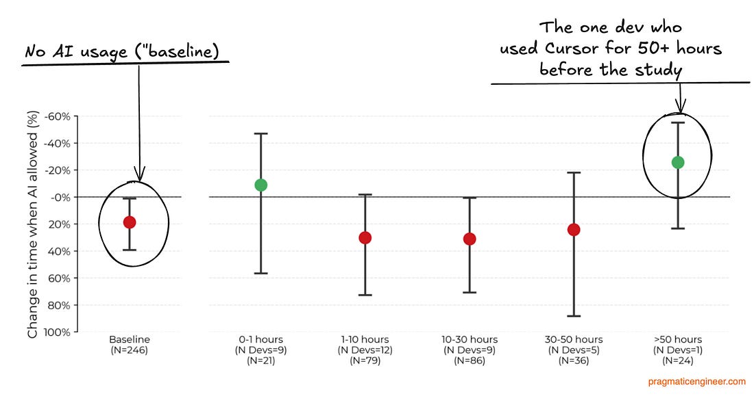 One developer with 50+ hours of experience on Cursor completed work much faster. Source: METR