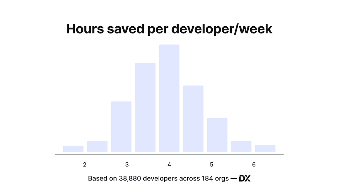 On one hand, that is incredible adoption. GitHub Copilot launched with general availability 3 years ago, and Cursor launched just 2 years ago. For 50% of all developers to use AI-powered dev tools in such a short time feels like faster adoption than any tool has achieved, to date. On the other hand, half of devs don’t even use these new tools once a week. It’s safe to assume many devs gave them a try, but decided against them, or their employer hasn’t invested. #3: How much time does AI save devs, really?In the same study, DX asked participants to estimate how much time these tools saved for them. On the median, it’s around 4 hours per week: Is four hours lots? It’s 10% of a 40-hour workweek, which is certainly meaningful. But it is nowhere near the amounts reported in the media: like Sam Altman’s claim that AI could make engineers 10x as productive. Google CEO Sundar Pichai also estimated that the company is seeing 10% productivity increase thanks to AI tools on a Lex Fridman podcast episode, which roughly matches the DX study. This number feels grounded to me: devs don’t spend all their time coding, after all! There’s a lot of thinking and talking with others, admin work, code reviews, and much else to do. #4: Why don’t AI tools work so great for orgs?Laura Tacho, CTO at DX told me: