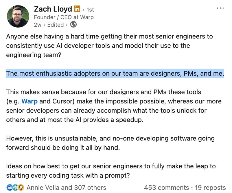 Martin expands on his thoughts in the article, LLMs bring a new nature of abstraction. 6. Open questionsThere are plenty of success stories in Big Tech, AI startups, and from veteran software engineers, about using AI tools for development. But many questions also remain, including: #1: Why are founders and CEOs much more excited?Founders and CEOs seem to be far more convinced of the breakthrough nature of AI tools for coding, than software engineers are. One software engineer-turned-founder and executive who runs Warpi, an AI-powered command line startup, posted for help in convincing devs to stop dragging their feet on adopting LLMs for building software: