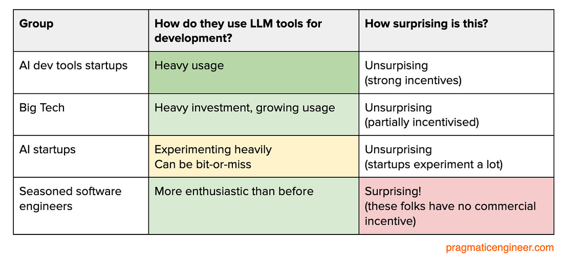 Software engineering with LLMs in 2025: reality checkHow are devs at AI startups and in Big Tech using AI tools, and what do they think of them? A broad overview of the state of play in tooling, with Anthropic, Google, Amazon, and othersHi – this is Gergely with the monthly, free issue of the Pragmatic Engineer Newsletter. In every issue, I cover challenges at Big Tech and startups through the lens of engineering managers and senior engineers. If you’ve been forwarded this email, you can subscribe here. Two weeks ago, I gave a keynote at LDX3 in London, “Software engineering with GenAI.” During the weeks prior, I talked with software engineers at leading AI companies like Anthropic and Cursor, in Big Tech (Google, Amazon), at AI startups, and also with several seasoned software engineers, to get a sense of how teams are using various AI tools, and which trends stand out. If you have 25 minutes to spare, check out an edited video version, which was just published on my YouTube channel. A big thank you to organizers of the LDX3 conference for the superb video production, and for organizing a standout event – including the live podcast recording (released tomorrow) and a book signing for The Software Engineer’s Guidebook. This article covers: