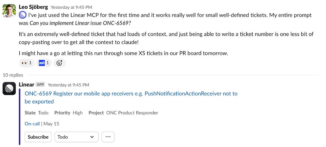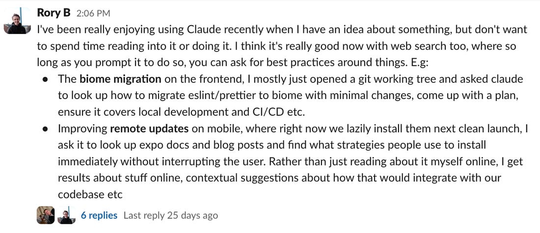 Developers are often selectively lazy, and some have started to automate previously tedious workflows. Amazon is likely the global leader in adopting MCP servers at scale, and all of this can be traced back to that 2002 mandate from Bezos pushing everyone to build APIs. 4. AI startupsNext, I turned to engineers working at startups building AI products, but not AI developer tools. I was curious about how much cutting-edge companies use LLMs for development. incident .ioThe startup is a platform for oncall, incident response, and status pages, and became AI-first in the past year, given how useful LLMs are in this area. (Note: I’m an investor in the company.) Software engineer Lawrence Jones said: