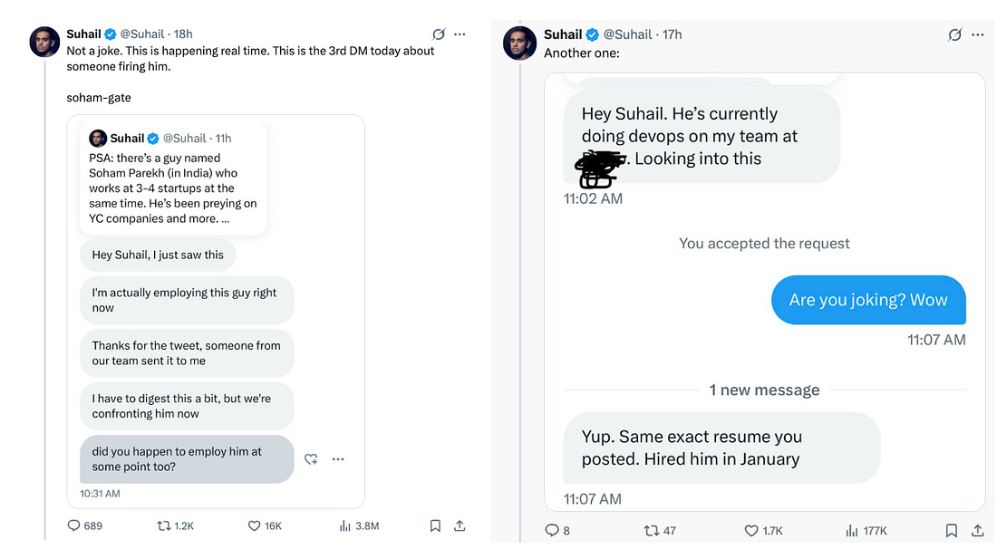 The bottom of this article could be cut off in some email clients. Read the full article uninterrupted, online. 1. ExposéYesterday (2 July), startup founder Suhail Doshi made an accusation: that a software engineer named Soham Parekh was working at several Y Combinator startups at once, and had been doing so for over a year, all while failing to do the work he was hired to do: