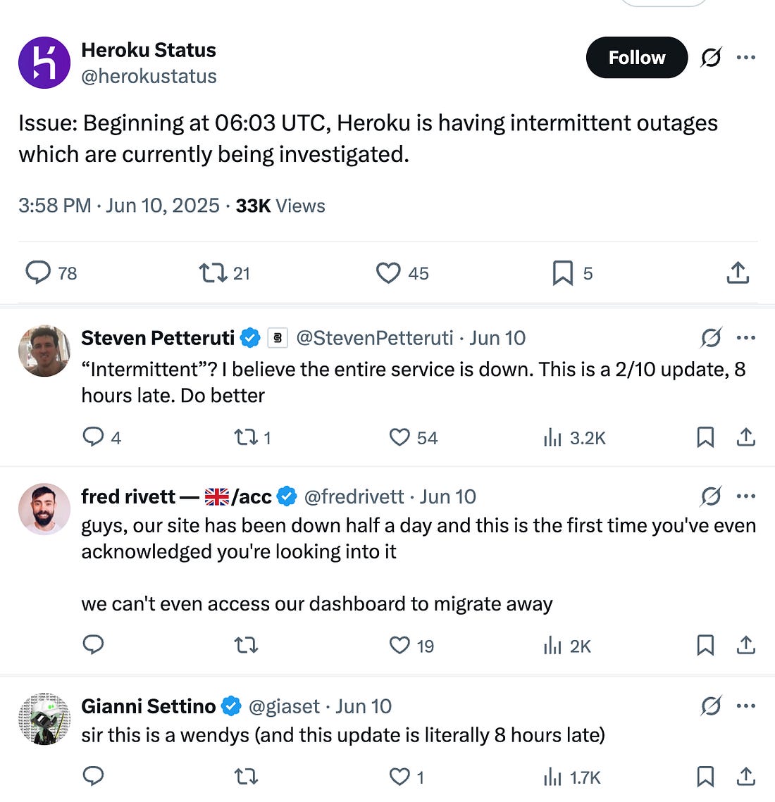 This 2025 incident was the worst in Heroku history: and yet I sense no real urgency coming from the company. Perhaps this is purely perception, and inside the company there’s a huge focus on resilience? If there is: it doesn’t show from the outside!