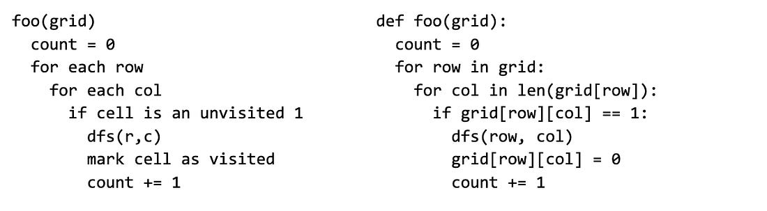 How to Sketch a Naive SolutionYou might ask what “sketch” means in this context. You shouldn’t code a solution, but minimally sketching it is a good use of time. For this, I recommend “indented English”, a middle ground between code and vaguely describing it out loud. It skips syntax and focuses on the code structure using indentation. Avoid full-blown pseudocode, with which it’s too easy to slip into writing real (often buggy) code. Consider the “indented English” on the left which focuses on the high-level idea, vs. the “pseudocode” on the right that has a bug. Pitfalls to avoid: