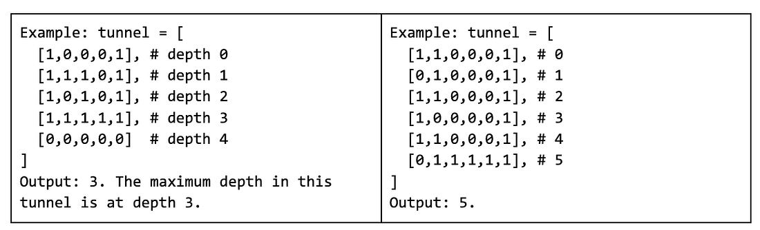 These aren’t hard rules, but they are guidance. If you aren’t given problem constraints during an in-person interview you can always ask the interviewer for them, but be mindful that not everyone will provide useful responses to such a nuanced question. When we have both the naive and TLE upper bounds, we take the lesser of the two as our final upper bound. How does identifying boundaries help?We know what you’re thinking: “that’s a lot of effort. How does it help?” To find out, let’s take a practical example with a new problem. Problem: maximum tunnel depth You're given an nxn binary matrix, tunnel, representing a tunnel network that archeologists have excavated. The ground level is above the first row. The first row is at depth 0, and each subsequent row is deeper underground.