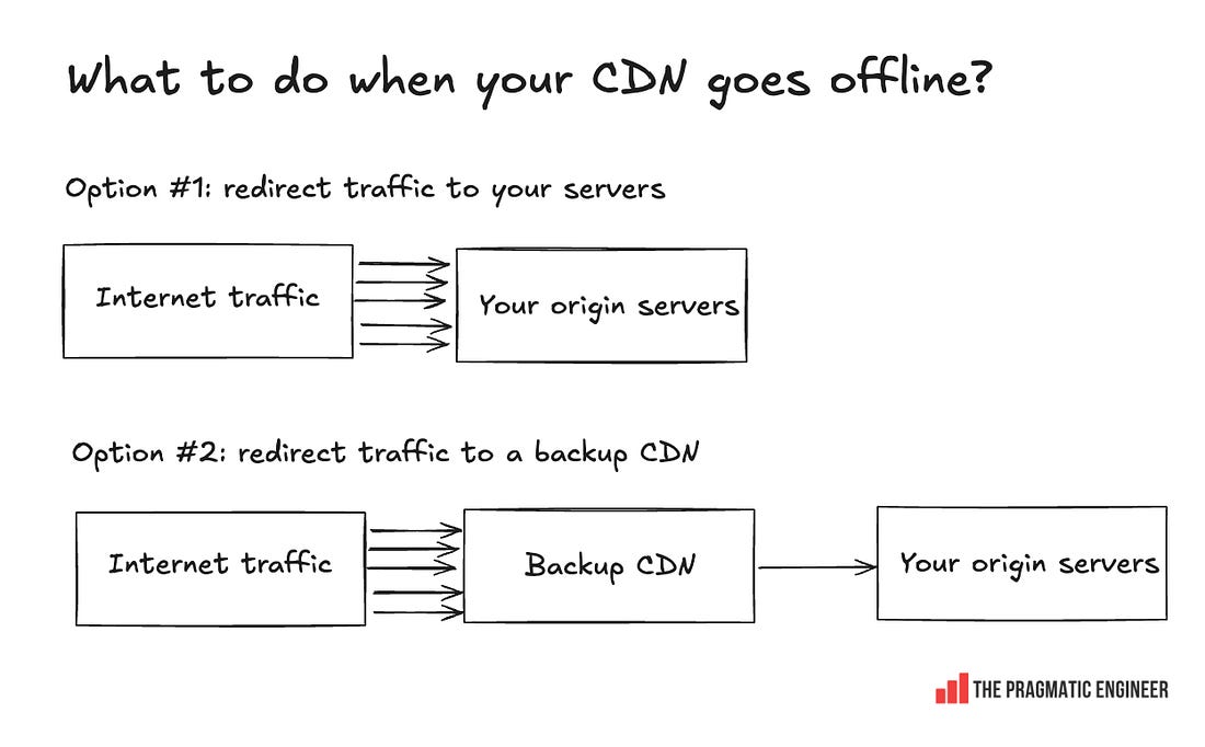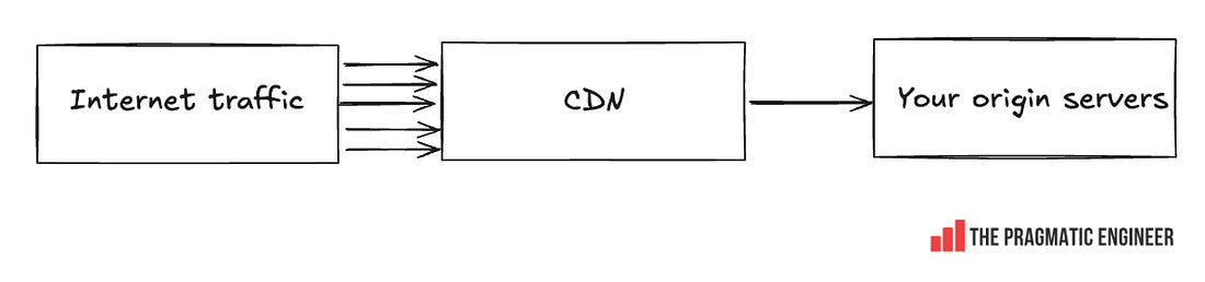 Talk about moving with the speed of a startup, despite being a publicly traded company! LearningsThere is much to learn from this incident, such as: Be explicit about logging errors when you raise them! Cloudflare could probably have identified the root cause of this error much faster if the line of code that returned an error, also logged the error, and if Cloudflare had alerts set up when certain errors spiked on its nodes. It could have surely shaved an hour or two off the time it took to mitigate. Of course, logging errors before throwing them is extra work, but when done with monitoring or log analysis, it can help find the source of errors much faster. Global database changes are always risky. You never know what part of the system you might hit. The incident started with a seemingly innocuous database permissions change that impacted a wide range of queries. Unfortunately, there is no good way to test the impact of such changes (if you know one, please leave a comment below!) Cloudflare was making the right kind of change by removing global systems accounts; it’s a good direction to go in for security and reliability. It was extremely hard to predict the change would end up taking down a part of their system – and the web. Two things going wrong at the same time can really throw an engineering team. If Cloudflare’s status page did not go offline, the engineering team would have surely pinpointed the problem much faster than they did. But in the heat of the moment, it’s easy to assume that two small outages are connected, until there’s evidence that they’re not. Cloudflare is a service that’s continuously under attack, so the engineering team can’t be blamed for assuming it might be more of the same. CDNs are the backbone of the internet, and this outage doesn’t change that. The outage hit lots of large businesses, resulting in lost revenue for many. But could affected companies have prepared better for Cloudflare going down? The problem is that this is hard: using a CDN means taking on a hard dependency in order to reduce traffic on your own servers (the origin servers), while serving internet users faster and more cheaply: When using a CDN, you propagate addresses that point to that CDN server’s IP or domain. When the CDN goes down, you could start to redirect traffic to your own origin servers (and deal with the traffic spike), or utilize a backup CDN, if you prepared for this eventuality. Both these are expensive to pull off: