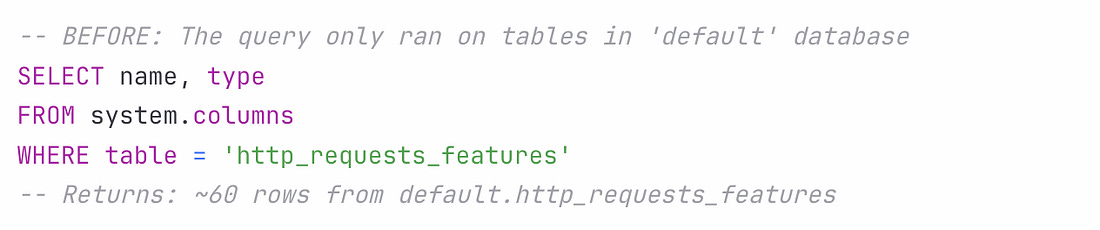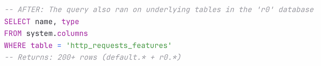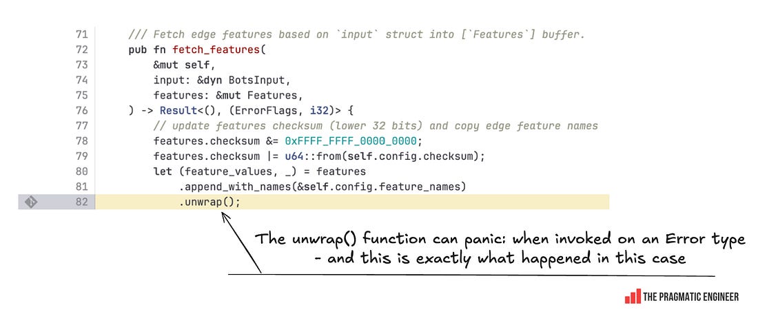 Here’s how the incident unfolded: A database permissions change in ClickHouse kicked things off. Before the permissions changed, all queries to fetch feature metadata (to be used by the Bot Management module) would have only been run on distributed tables in Clickhouse, in a database called “default” which contains 60 features. Until now, these queries were running using a shared system account. Cloudflare’s engineering team wanted to improve system security and reliability, and move from this shared system account to individual user accounts. User accounts already had access to another database called “r0”, so the team made the database permission change for access to r0 to be implicit instead of explicit. As a side effect of this, the same query collecting the features to be passed to Bot Management started to fetch from the r0 database, and return many more features than expected: The Bot Management module does not allow loading of more than 200 features. This limit was well above the production usage of 60, and was put in place for performance reasons: the Bot Management module pre-allocates memory for up to 200 features, and it will not operate with more than this number. A system panic hit machines served with the incorrect feature file. Cloudflare was nice enough to share the exact code that caused this panic, which was this unwrap() function: