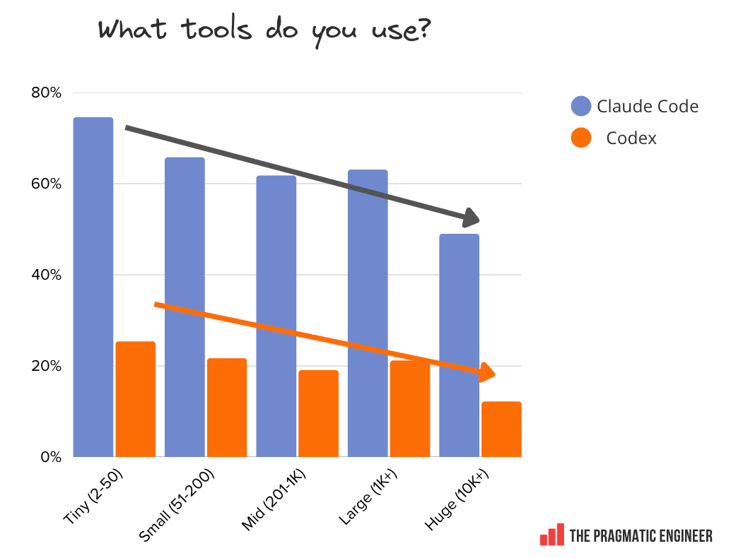 It looks like that if you don’t use AI agents on a regular basis, you may have a negative opinion about the tools, in general, which could come at the cost of not experiencing what the technology has to offer. 6. Company size and tool usageIn our results, company size and tooling choice correlate for some tools; for example, the smaller a team or company is, the more likely it is to use Claude Code or Codex: Claude Code is used by a whopping 75% of the smallest companies and teams. This is a big number, far ahead of any other tools. At the smallest places, the most-used tools are, in order: