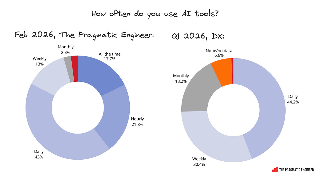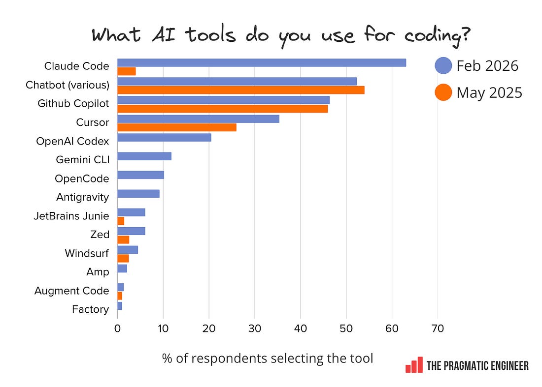 👋 Hi, this is Gergely with a subscriber-only issue of the Pragmatic Engineer Newsletter. In every issue, I cover challenges at Big Tech and startups through the lens of engineering managers and senior engineers. If you’ve been forwarded this email, you can subscribe here. AI Tooling for Software Engineers in 2026Claude Code dominates tool usage, leaders are more positive about AI than engineers, staff+ engineers are the biggest users of AI agents, and more. Exclusive data and analysis from 900+ respondentsWhich AI tools are software engineers using, and what do they really think of them? We asked The Pragmatic Engineer subscribers, and nearly a thousand of you have shared your experiences of using AI tools for work. This article provides a high-level overview of those findings from our latest AI tooling survey. Thank you to everyone who participated! There are plenty of interesting details, most notably, validation of just how much Anthropic and Claude Code have risen to dominate tooling usage. Claude Code is today nearly as widespread as GitHub Copilot was in our survey three years ago (in the spring of 2023) – which shows how fast the AI market moves. In today’s issue, we cover: