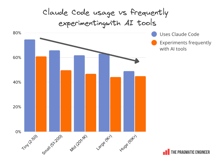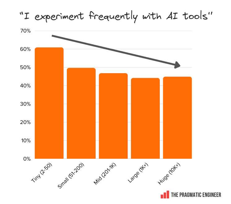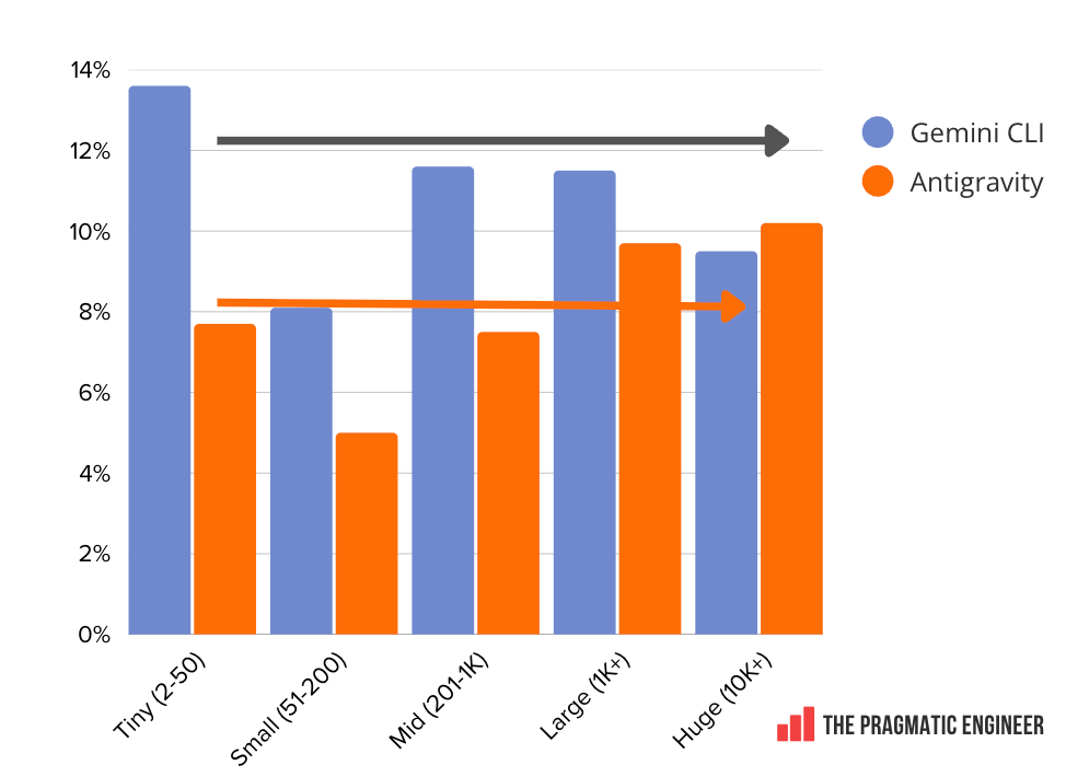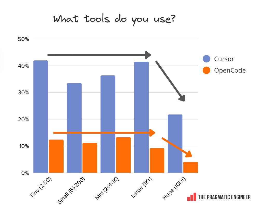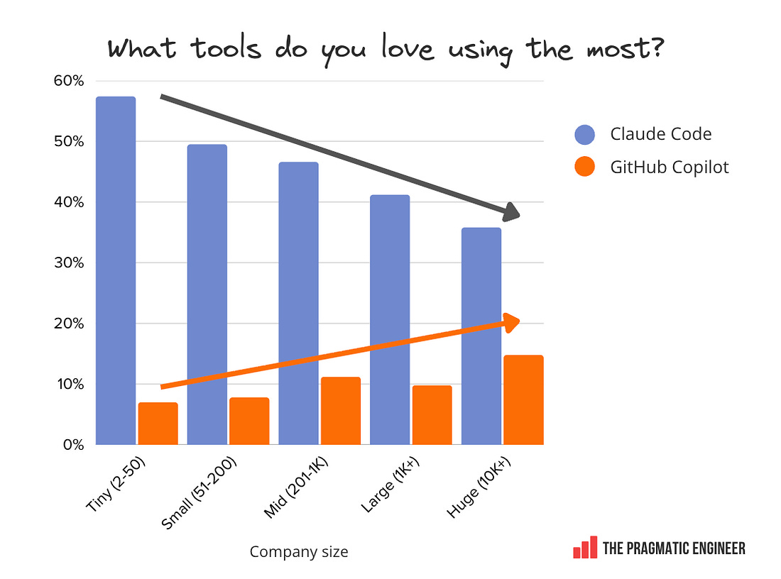 GitHub Copilot overtakes Claude Code at large companies. This confirms what was known: Microsoft is very good at enterprise sales, and at bundling GitHub Copilot in its suite of products: Cursor and OpenCode usage drops at massive companies with similar usage patterns. Across the board, usage is roughly the same, regardless of company size. We only see a drop at the very largest of companies with 10,000+ employees: One theory for such a drop at massive companies could be that large companies often build their own internal coding agents that engineers use; e.g., at fintech, Block, the agent is called Goose, Meta has its own agent, as does Google with Jetski (its version of Antigravity) and Cider. Google’s tools are evenly used across the spectrum of company size. Google’s Gemini CLI and Antigravity are the only tools in this survey whose usage is notably stable, regardless of company size. Both tools hover at around 10% from the smallest to largest workplaces: The feeling among survey respondents that they can experiment at work, correlates with Claude Code being available. We asked if readers experiment frequently with tools. Below are the “yes” responses by company size: When these responses are mapped to the percentage of people using Claude Code, there’s a very similar distribution. My theory is that Claude Code is new enough at 9 months old to have not yet been approved at companies with bureaucratic processes for approving new tools, and this is partly why some respondents feel their chance to experiment with the range of tooling is being thwarted. Engineers at places with lots of red tape for tooling are less empowered to experiment with new AI tools; not just Claude Code, but any new, interesting tool. 7. Tools engineers loveWe asked respondents: “Which AI tools do you love using the most, and why?” Below are the tools which respondents enjoy most, in descending order of number of mentions: Claude and Cursor stand out in terms of how much they are loved. A whopping 57% of respondents mention either Claude Code (46%) or Claude models (11%) as the tools they are attached to. Cursor was at a respectable 19% – double GitHub on 9%. Other notable tools with two or more mentions: