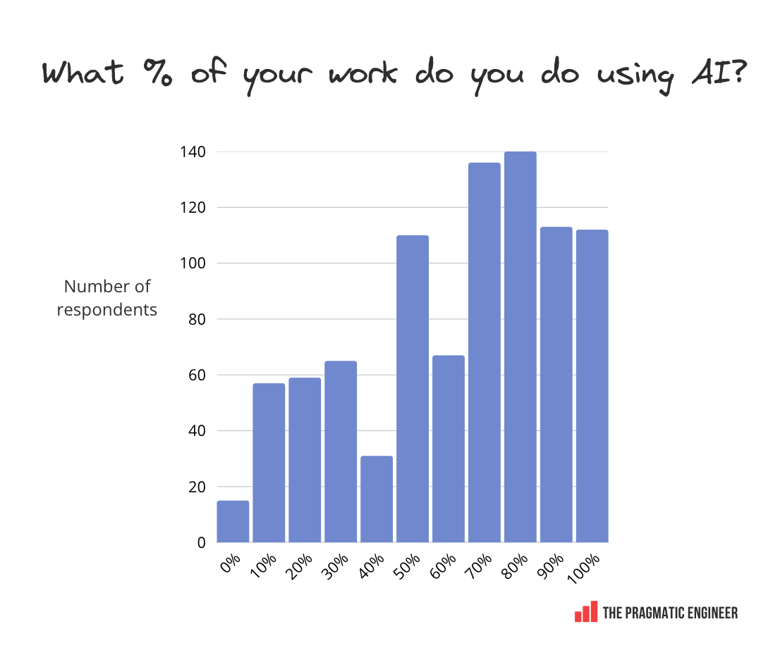 4. AI trends: Mainstream adoption achievedHow often do people use AI tools? Very often, as it turns out; 95% of respondents are using them weekly, at a minimum: It’s worth reflecting on this data in relation to insights presented by Laura Tacho at the recent Pragmatic Summit in San Francisco: It seems that AI is now mainstream in software engineering. Anecdotally, this has been my sense since the beginning of the year: everyone whom I talk with is using AI tooling on a roughly daily basis. Now, there’s data to prove it. How much software engineering work gets done with AI?This year, we asked readers to estimate the percentage of their software engineering work that’s done using AI. The results: The data show that AI is embedded in the workflows of participants in our survey: