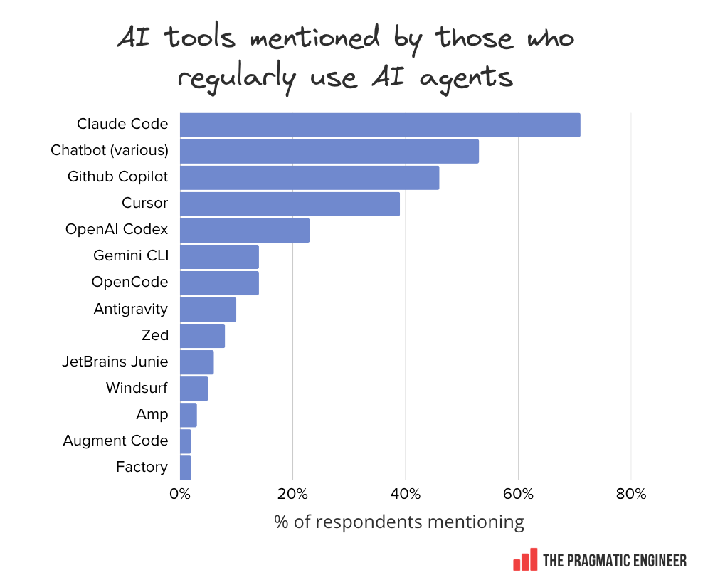 Let’s jump into some of the data: 2. Most-used AI toolsJust eight months after its release, Claude Code is already the most-used tool, overtaking both GitHub Copilot and Cursor: Tools mentioned, in order of popularity: