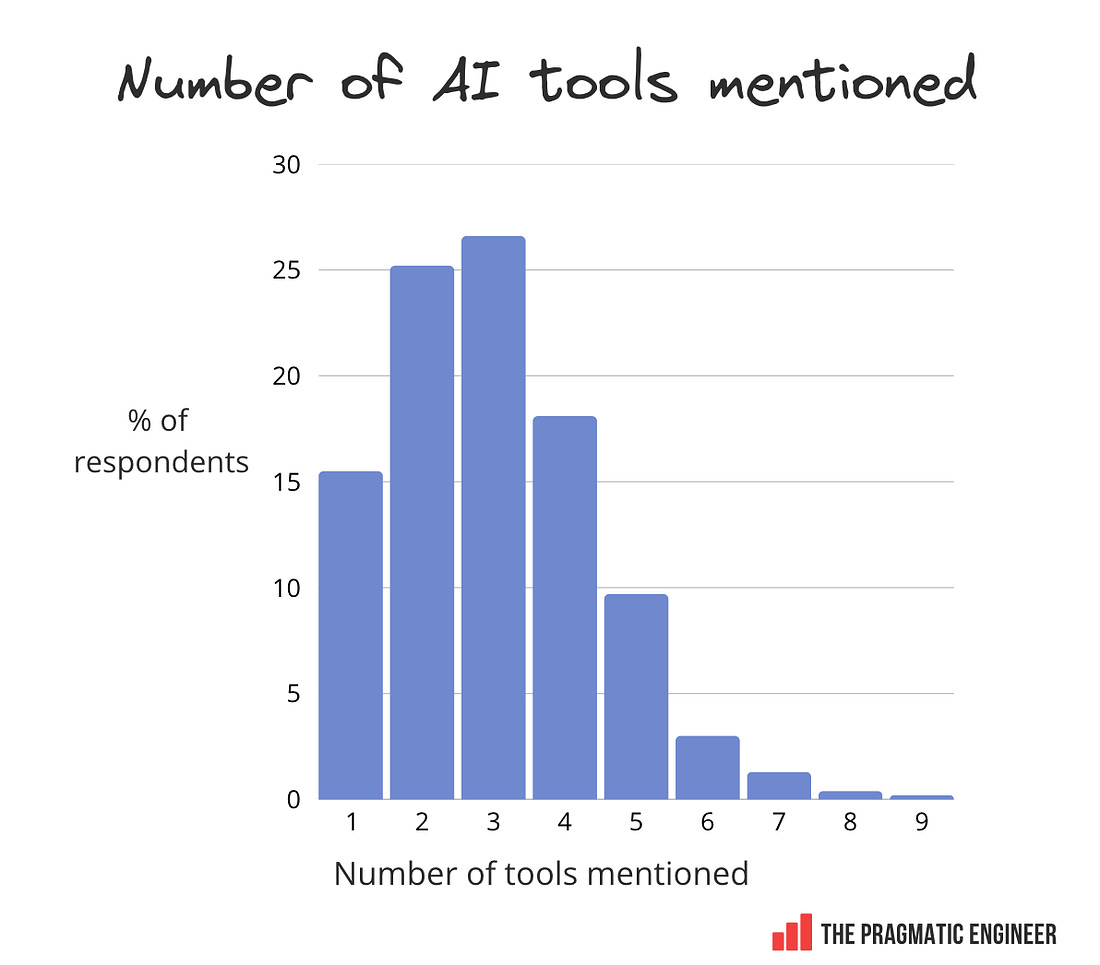 Chatbot usage: ChatGPT leads – just aboutHere’s how mentions of chatbot usage line up in our survey: Tool usage: multi-toolMost tech professionals use between two and four AI tools. An interesting detail is how many different ones are mentioned by respondents: Noteworthy details: