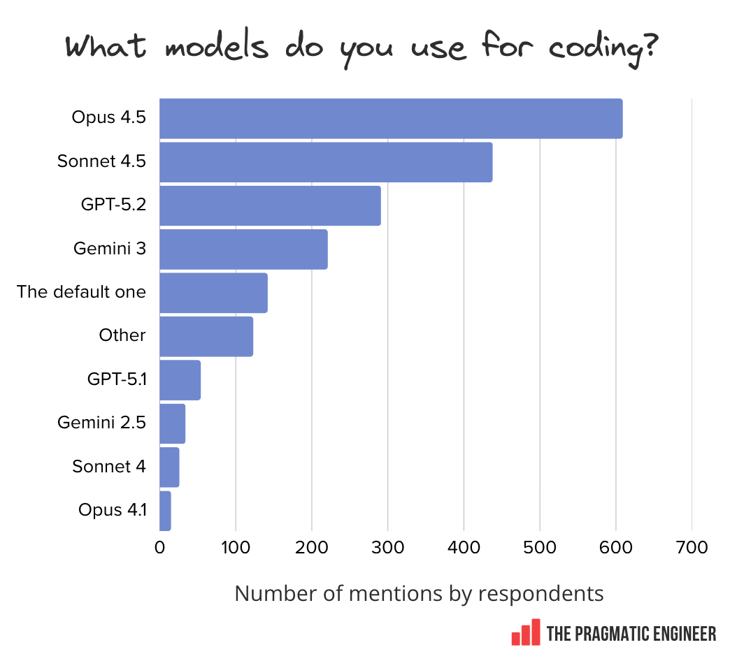 3. Popular modelsAnthropic’s Opus and Sonnet dominate the ranking of models used for coding. This is not even a contest: Opus 4.5 and Sonnet 4.5 (latest models at the start of our survey) come up more often than all other models, combined. Anthropic has become the go-to model developer for coding-related work – for now, that is. When this survey launched, Opus 4.6, Sonnet 4.6, and GPT-5.3 were not yet out. Around 1 in 8 respondents say they just use whatever model is the default at their company. This is interesting to note: these are likely folks who might not bother changing default settings, and just go with whatever’s available. If the default model is powerful enough, that’s fine, but if the company’s default is a cheaper, less capable model, then these people could face a more frustrating experience than those who get to choose what they use. In the “other” category of models, some other mentions include: