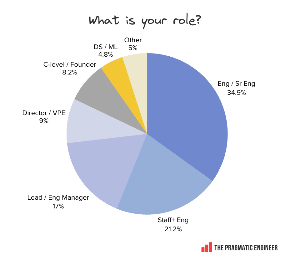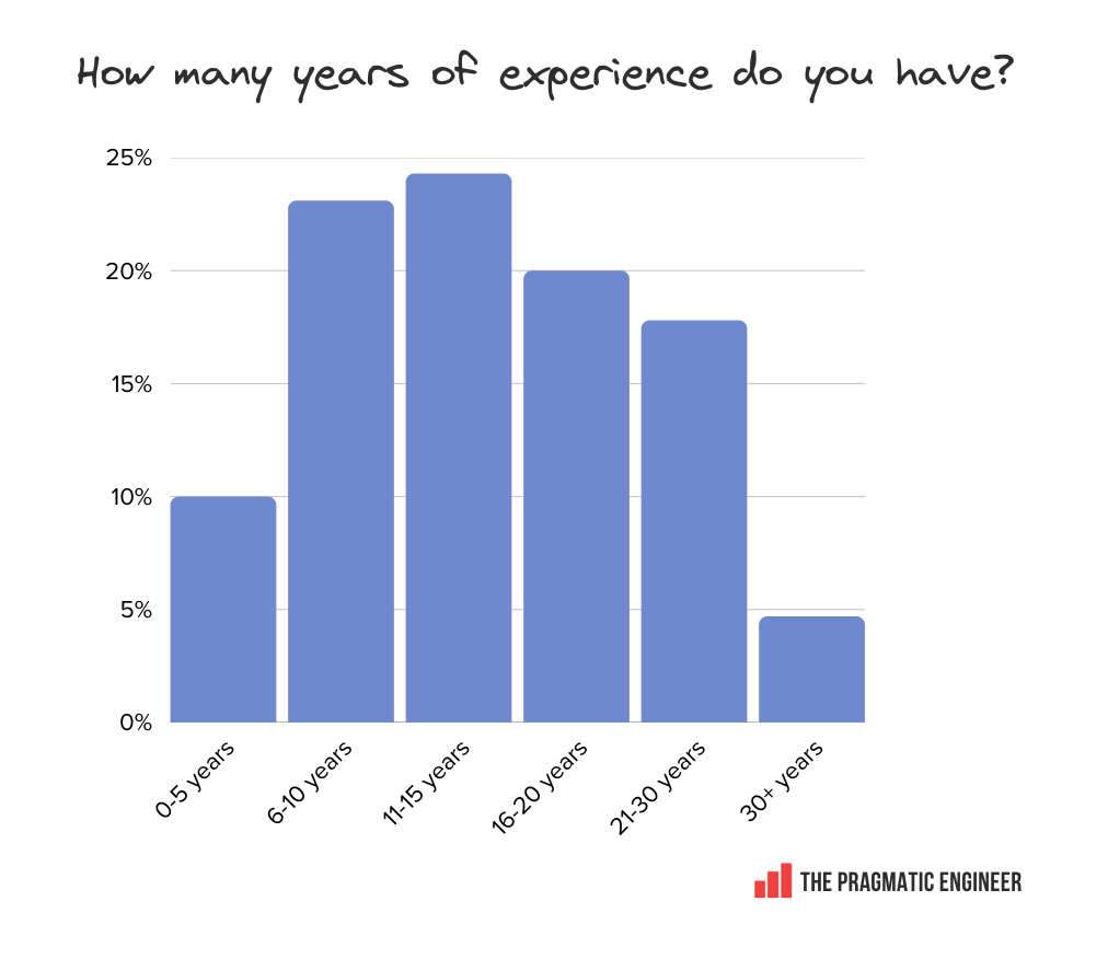 Claude Code is especially loved by Director-and-above folks. Segmenting the “most loved” responses by level (engineers up to the senior levels of staff+ engineers, leads/eng managers, and Director+ folks): Both Claude Code and Cursor become less loved – or used! – as seniority goes up, but it’s notable that folks in senior engineering leadership positions are obsessed with Claude Code, but not Cursor. GitHub Copilot is equally loved by engineering managers as Cursor is — and this is surprising: Both OpenCode and GitHub Copilot are surprisingly loved by Staff+ engineers. Another unexpected detail is that, despite OpenCode being used about a quarter as much as GitHub Copilot, it rivals the “loved” mentions. For Staff+ engineers, it matches GitHub on those terms: Finally, when segmenting based on company size, we see the familiar pattern of Claude Code vs GitHub Copilot. Claude Code is less frequently mentioned as a “loved” tool as company size increases. GitHub Copilot sees the opposite trajectory: it’s more loved within larger companies where it’s likely to be harder to experiment with alternatives. 8. DemographicsIn closing, below are details about who took the survey, and how the 906 responses came together. Engineers comprise 55% of respondents, and engineering leadership another 34%: Respondents are experienced professionals. The median respondent has 11-15 years of experience: Company size is also a fairly even split across this group: Region-wise, most respondents are in Europe or the US: Takeaways and the full reportWe have compiled additional findings from this survey which did not fit in this article: it’s a 35-page article:... Subscribe to The Pragmatic Engineer to unlock the rest.Become a paying subscriber of The Pragmatic Engineer to get access to this post and other subscriber-only content. A subscription gets you: