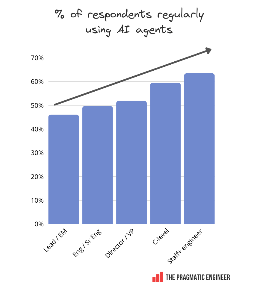 A common arrangement in the survey is the split-screen setup: a terminal with Claude Code open to drive work, and an IDE also open to review changes made by the agent. The tools mentioned by those who regularly use AI agents split almost identically to the broader survey results: Staff+ engineers are the heaviest users of agents. Here’s the data on agent usage by experience level: This data point is slightly amusing because it shows there’s not much difference between the lowest and highest levels: 46% of leads and engineering managers say they use AI agents regularly, while for Staff+ engineers it’s 63%. Does it suggest the most experienced engineers are also the most curious? The more someone uses AI, the more they also use AI agents. We segmented the data by the percentage of software engineering work that respondents do with AI: