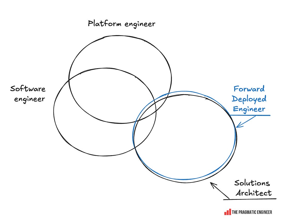 Last summer, we covered the rise of the FDE role, and looked into what it’s like. Back then, this is how I visualized what was then a very hot role: At the companies where I interviewed FDE folks – OpenAI and Ramp – the role seemed to live up to this visualization. However, I’ve since talked with two engineers who took FDE roles and were disappointed. This is how they saw it, in practice: The role seems akin to a “sales engineer” where FDEs help close the deals, or a solutions engineer (or even consultant), where FDEs deploy to a customer to build them a solution. They don’t contribute back into the platform, and don’t do much that’s considered “software engineering” beyond integrating software which the product team built. Some engineers figure out the nature of the role during the interview process and pass on it. Meanwhile, some others take the job and later quit. Here’s what a dev told me who accept an FDE role at a company, but didn’t find what they expected: