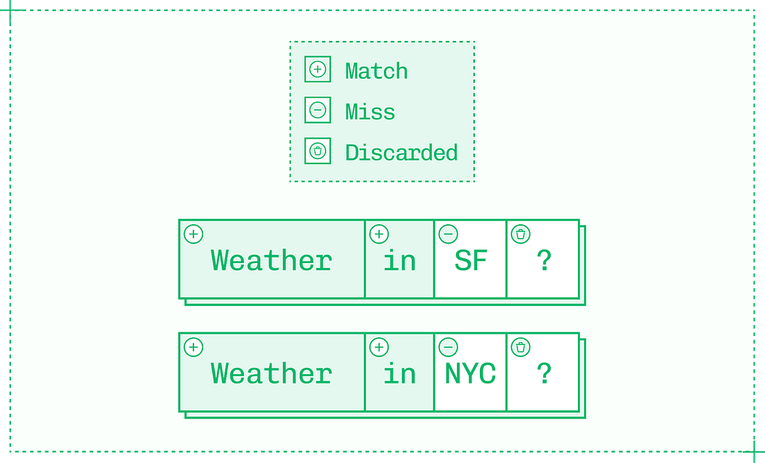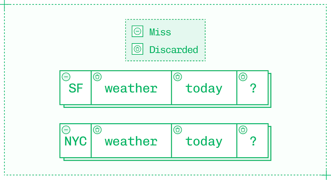 Token acceptance rate is high early in the draft sequence, but draft tokens get less reliable deeper in the sequence. Aim for short, high-percentage sequences because while generating and validating tokens is inexpensive relative to generating tokens in the original model, it still comes with meaningful overhead. Additionally, once a single draft token is rejected as wrong, all subsequent tokens in the sequence are also rejected. Working with speculation is interesting because so many factors affect token acceptance rate. The big one is the temperature parameter – higher temperatures yield token distributions that are harder to predict, reducing the effectiveness of speculative decoding. But even factors as simple as subject matter can make a difference on acceptance rate if the draft model or additional decoder head used for speculation is better versed in, say, math than history. Another limitation on speculative decoding is that it’s most useful at low batch sizes where there are spare compute cycles. At higher batch sizes, speculative decoding must be dynamically disabled as compute is too saturated to afford verification. Each speculation algorithm navigates these tradeoffs differently, and careful implementation of the right algorithm for the situation can lead to major improvements in TPS. Approach #3: CachingDuring prefill, the inference engine builds a KV cache (a store of keys and values for each token) on the input sequence. It then updates the KV cache for each token during decode. As inference is autoregressive, the value for each new token depends on the value of every previous token in the sequence. Every inference engine uses KV caching by default on a request-by-request basis. Without KV caching, LLM inference would be unbearably slow since each previous value in the entire sequence would need to be recalculated for each subsequent token. However, engineers can get more utility from the KV cache by reusing it between requests rather than solely within each inference sequence. Consider the following two prompts, each with four tokens on most tokenizers: By default, the inference engine has to run prefill on all four tokens of each prompt. But the first tokens of each prompt – “Weather in” – form a shared prefix between the pair. With prefix caching, you can reuse the KV cache from the first request to improve TTFT on the second request by skipping prefill on the first two tokens and reading in the existing KV cache instead. When you see pay-per-token APIs charge less for “cache hit” input tokens than “cache miss” tokens, this is why: reusing cached tokens takes very little compute power and time. As an inference engineer, you can apply the same principle to reduce latency, improve throughput and therefore save money on your own deployments. Saving two tokens won’t make a big impact on TTFT, but prefix caching can skip prefill on thousands of tokens in certain domains: