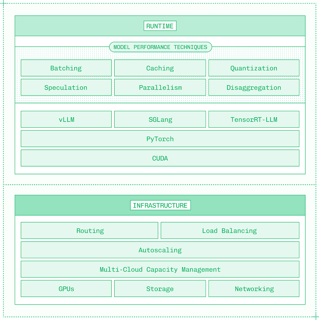 These three layers must work together to create a system that can handle mission-critical inference at scale. The runtime layer is responsible for ensuring an individual model running on a GPU (or across several GPUs in a single instance) runs as performantly and efficiently as possible. This layer depends on a sophisticated software stack, from CUDA, to PyTorch, to inference engines like vLLM, SGLang, and TensorRT-LLM. Low-level optimization is important, with kernels like FlashAttention delivering significant performance gains. The runtime layer relies on a number of model performance techniques that apply new research to the challenges of inference on generative AI models: