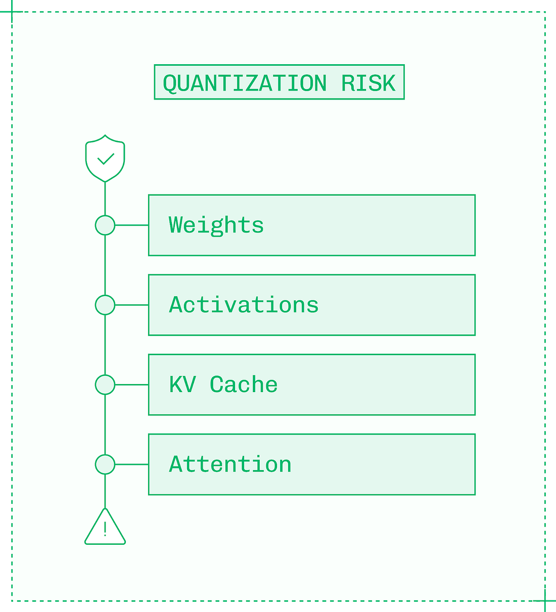 More granular quantization has a lower chance of smoothing over outliers, which preserves quality. However, more granularity also introduces extra overhead for storing and applying scale factors. The components of a model have varying sensitivities to quantization. Reducing the precision of more sensitive components runs a higher risk of quality degradation. From the least to most sensitive components: