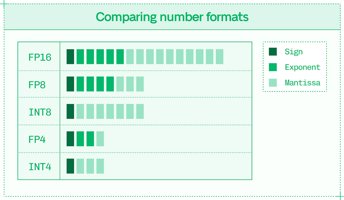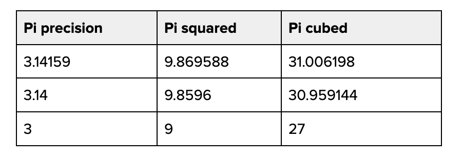 Working with quantized data introduces overheads, so it’s not linearly twice as fast to go from 16 to 8 bits. In practice, quantization down a single level of precision generally offers 30%-50% better performance for LLMs. The catch with quantization is that it runs the risk of reducing a model’s output quality, and has the potential to introduce precision errors throughout the calculations that power inference. Precision errors compound over time. Consider what happens when you square and cube different precisions of Pi: Most of the work in quantization is in preventing precision errors and minimizing their impact on the final model output. Sixteen-bit, 8-bit, and 4-bit precisions are the primary formats for inference. Number formats contain: