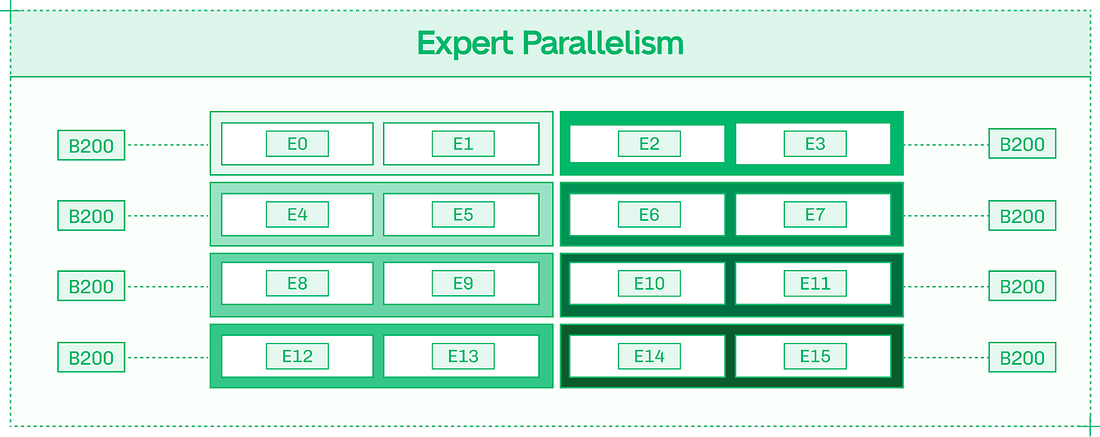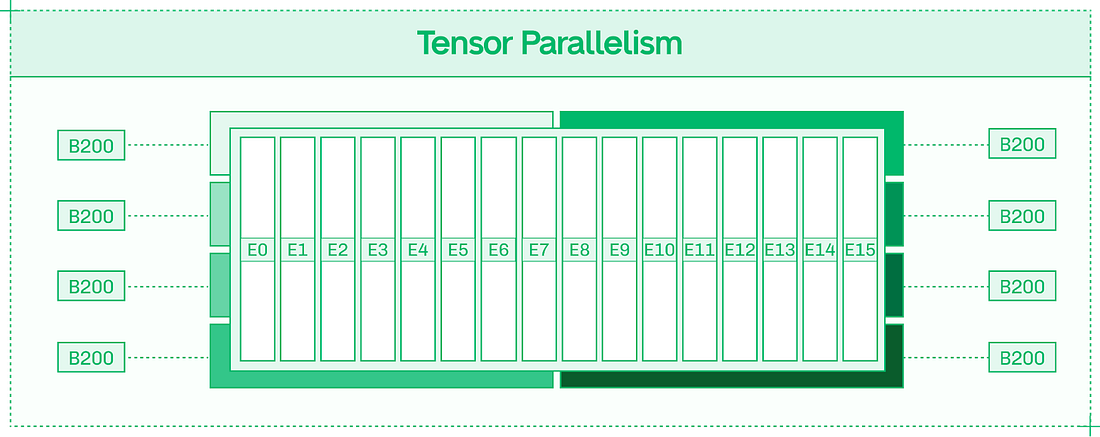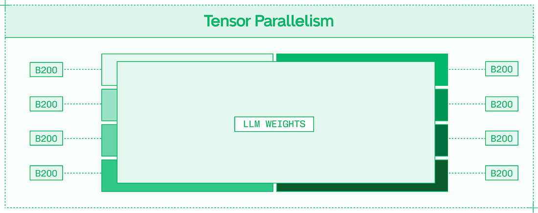 Prefix caching works from the start of the input sequence until the first non-repeated token. The fourth token in the weather example, a question mark, is shared between the two input sequences. However, the prefix ends at the first non-repeated token, so the fourth token isn’t read from cache. Since prefixes end at the first unique token, your context engineering determines TTFT savings. Consider a different approach to the same prompt: Here, there is no savings from prefix caching, as the very first token differs between the two sequences, even though every subsequent token is the same. To take advantage of prefix caching, ensure that novel tokens are as late in your prompt as possible. Approach #4: ParallelismTensor Parallelism (TP) should be your default strategy for multi-GPU model inference. It supports dense models like Llama 405B, and the MoE (mixture of experts) models that currently dominate the open model landscape. TP works by splitting apart each layer of the model (as opposed to Pipeline Parallelism, which keeps layers intact) and distributing the layer fragments across the allocated GPUs. For each layer, the expense of reading from weights’ memory and executing matrix multiplication is shared across the GPUs. However, the results of each layer need to be communicated in an all-reduce fashion (across all eight GPUs) into a single output before the next layer can be computed. In nodes with high-bandwidth intra-node NVLink and NVSwitch, this communication overhead is minimized. Increasing Tensor Parallelism improves TPS on a per-user basis, assuming the model is large enough and the sequences are long enough that the communication overhead doesn’t outweigh the faster forward pass – which is the case for most frontier models. Expert Parallelism (EP) neatly divides experts across GPUs, so that in a model with 128 experts served in EP8 across eight GPUs, each GPU hosts 16 full experts. EP improves total system throughput, making inference more scalable and less expensive. With individual experts processing tokens separately, each token takes just as long, but the system as a whole can handle more simultaneous tokens. Many deployments use a mix of TP and EP to achieve both benefits. EP requires less inter-GPU communication than Tensor Parallelism. The Expert Router, which determines which experts each token activates, is replicated onto each GPU as it is a relatively small component of the model. Inter-GPU communication is necessary for passing tokens from expert to expert, but unlike TP, it is not required to collect the results of each layer. Thanks to this lower communication overhead, EP scales well to multi-node deployments and systems with limited interconnect bandwidth. Approach #5: DisaggregationDisaggregation combines three important ideas in inference engineering: