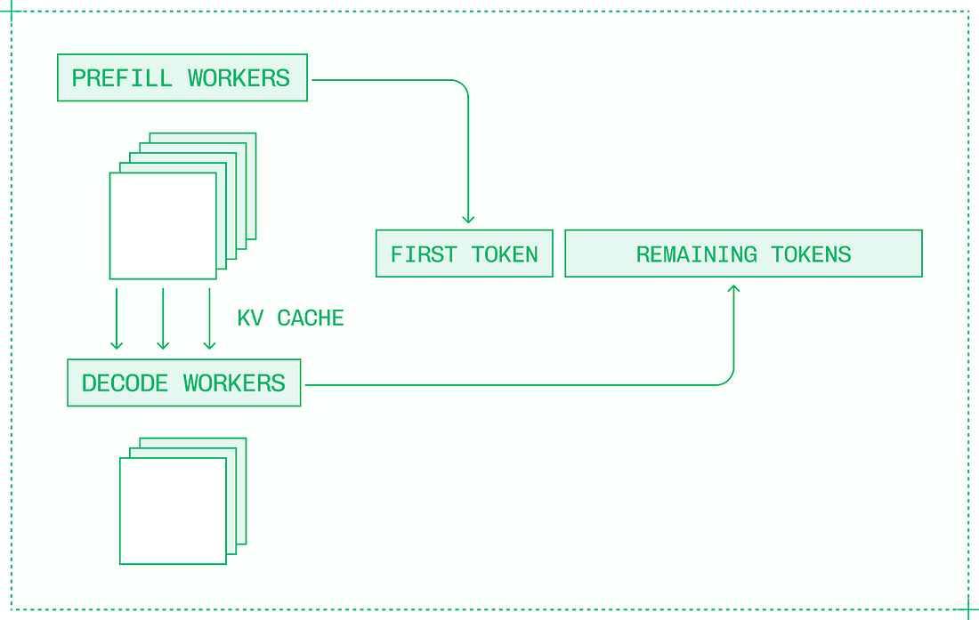 When prefill and decode run on the same node under heavy traffic, they have a higher chance of interfering with one another. Ideally, prefill uses more compute resources, while decode uses more memory, and the two can co-exist efficiently. However, with larger batches and more compute-intensive optimizations, prefill and decode start competing for resources. Disaggregation, or disaggregated serving, is the idea of separating prefill and decode into separate engines on separate GPUs or nodes. Disaggregation turns LLM inference into a three-step process:
