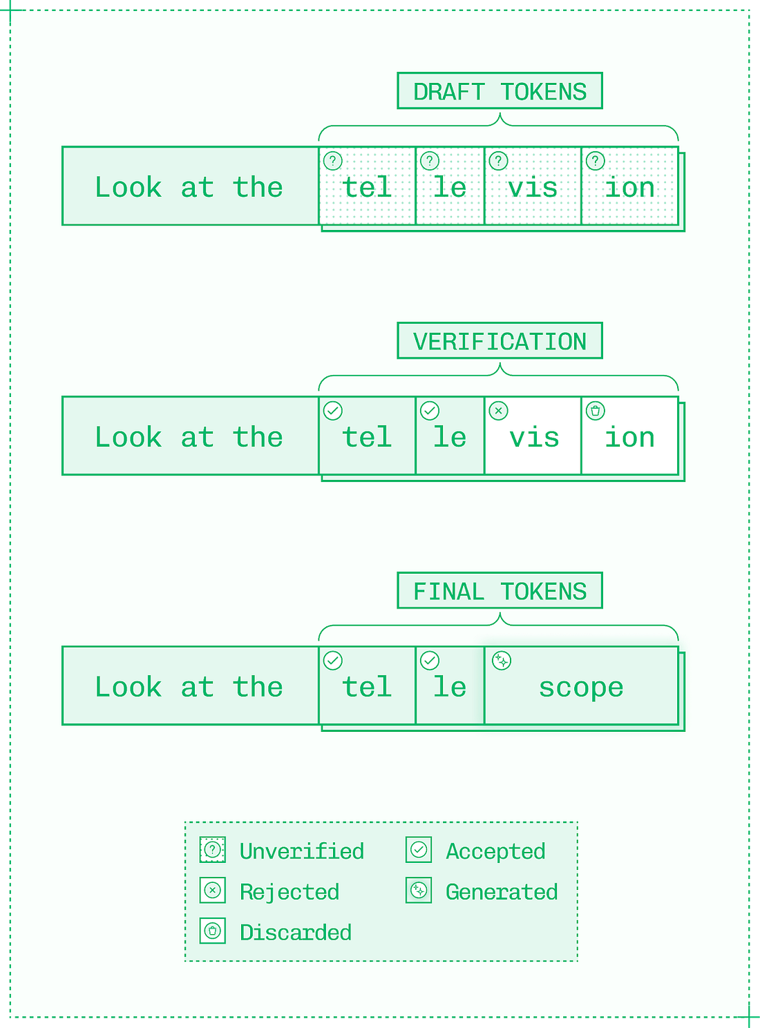 This generates N+1 tokens per forward pass, or iteration through the decode loop, where N is the number of accepted draft tokens. Generating draft tokens is not free, it takes both compute and memory. However, it is much faster for a target model to validate a draft token than to generate an original token. If you imagine a sudoku puzzle, solving it is hard, but checking if the solution is correct is very easy. For the target model, generating a token is like solving a sudoku, while validating a draft token is like checking a finished sudoku. The performance uplift from any speculative decoding strategy depends on three factors: